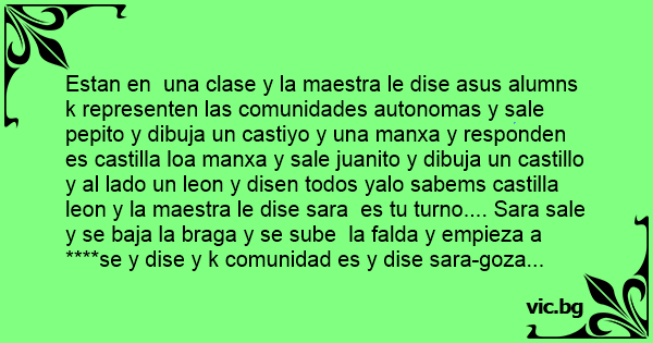 Estan en una clase y la maestra le dise asus alumns k representen las comunidades autonomas y sale pepito y dibuja un castiyo y una manxa y responden es castilla loa manxa y sale juanito y dibuja un castillo y al lado un leon y disen todos yalo sabems castilla leon y la maestra le dise sara es tu turno.... Sara sale y se baja la braga y se sube la falda y empieza a ****se y dise y k comunidad es y dise sara-goza...