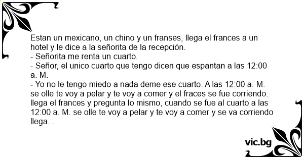 - Yo no le tengo miedo a nada deme ese cuarto. A las 12:00 a. M. se olle te voy a pelar y te voy a comer y el fraces se fue corriendo. llega el frances y pregunta lo mismo, cuando se fue al cuarto a las 12:00 a. M. se olle te voy a pelar y te voy a comer y se va corriendo llega el maxicano y pregunta lo mismo, cuando se fue al cuarto a las 1200 a. M. se olle te voy a pelar y te voy a comer que se levanta y abre la cortina y ve a un monito sentado en la orilla de la ventana diciendole a su banana te voy a pelar y te voy a comer.