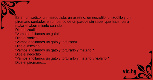 Een sadist, een masochist, een seriemoordenaar, een necrofiel, een zofiel en een pyromaan, zitten op een bankje in het park en vervelen zich te pletter Zegt de zoofiel : - Kom, we pakken een kat....