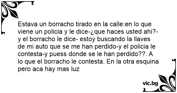 Estava un borracho tirado en la calle:en lo que viene un policia y le dice-¿que haces usted ahi?-y el borracho le dice- estoy buscando la llaves de mi auto que se me han perdido-y el policia le contesta-y puess donde se le han perdido??. A lo que el borracho le contesta. En la otra esquina pero aca hay mas luz