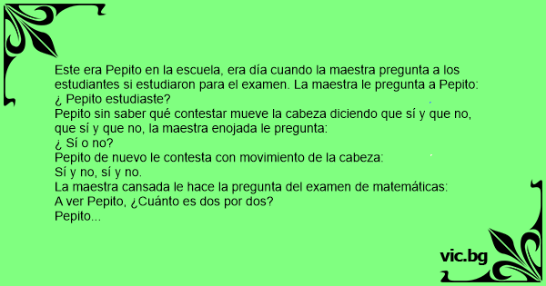 Este era Pepito en la escuela, era día cuando la maestra pregunta a los estudiantes si estudiaron para el examen. La maestra le pregunta a Pepito: