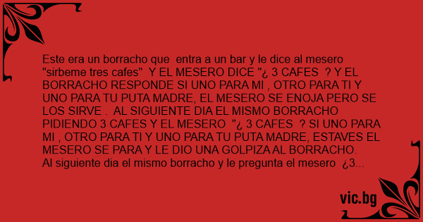 Este era un borracho que entra a un bar y le dice al mesero "sirbeme tres cafes" Y EL MESERO DICE "¿ 3 CAFES ? Y EL BORRACHO RESPONDE SI UNO PARA MI , OTRO PARA TI Y UNO PARA TU РUТА MADRE, EL MESERO SE ENOJA PERO SE LOS SIRVE . AL SIGUIENTE DIA EL MISMO BORRACHO PIDIENDO 3 CAFES Y EL MESERO "¿ 3 CAFES ? SI UNO PARA MI , OTRO PARA TI Y UNO PARA TU РUТА MADRE, ESTAVES EL MESERO SE PARA Y LE DIO UNA GOLPIZA AL BORRACHO.