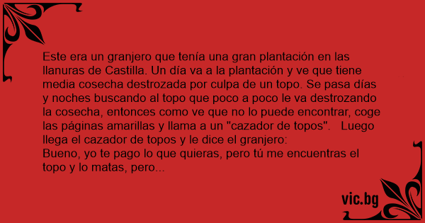 Este era un granjero que tenía una gran plantación en las llanuras de Castilla. Un día va a la plantación y ve que tiene media cosecha destrozada por culpa de un topo. Se pasa días y noches buscando al topo que poco a poco le va destrozando la cosecha, entonces como ve que no lo puede encontrar, coge las páginas amarillas y llama a un "cazador de topos". Luego llega el cazador de topos y le dice el granjero: