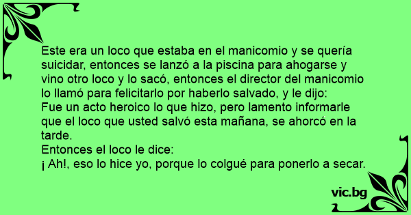 Este era un lосо que estaba en el manicomio y se quería suicidar, entonces se lanzó a la piscina para ahogarse y vino otro lосо y lo sacó, entonces el director del manicomio lo llamó para felicitarlo por haberlo salvado, y le dijo: