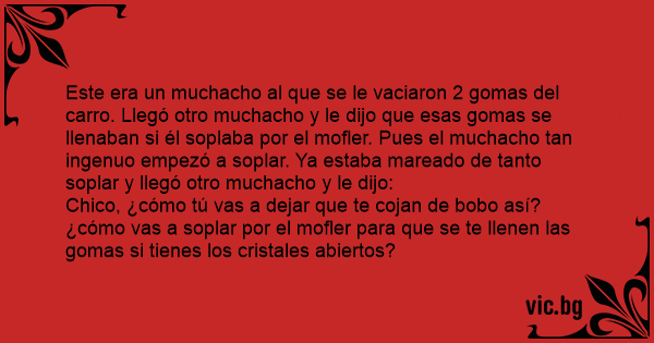 Este era un muchacho al que se le vaciaron 2 gomas del carro. Llegó otro muchacho y le dijo que esas gomas se llenaban si él soplaba por el mofler. Pues el muchacho tan ingenuo empezó a soplar. Ya estaba mareado de tanto soplar y llegó otro muchacho y le dijo: