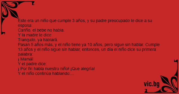 Pasan 5 años más, y el niño tiene ya 10 años, pero sigue sin hablar. Cumple 13 años y el niño sigue sin hablar, entonces, un día el niño dice su primera palabra: