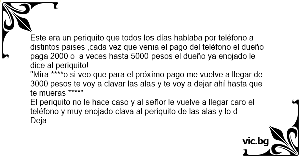 Este era un periquito que todos los días hablaba por teléfono a distintos paises ,cada vez que venia el pago del teléfono el dueño paga 2000 o a veces hasta 5000 pesos el dueño ya enojado le dice al periquito!