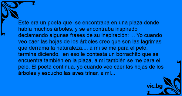 Este era un poeta que se encontraba en una plaza donde había muchos árboles, y se encontraba inspirado declamando algunas frases de su inspiración: .. Yo cuando veo caer las hojas de los árboles creo que son las lagrimas que derrama la naturaleza.... a mi se me para el pelo, termina diciendo, en eso le contesta un borrachito que se encuentra también en la plaza, a mi también se me para el pelo. El poeta continua, yo cuando veo caer las hojas de los árboles y escucho las aves trinar, a mi se me para el pelo; A lo que responde nuevamente el borrachito: A mí también se me para el pelo, entonces el poeta le pregunta, oiga amigo ¿es usted poeta también? No, yo soy el que barre la plaza.