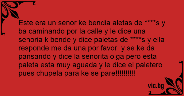 Este era un senor ke bendia aletas de ****s y ba caminando por la calle y le dice una senoria k bende y dice paletas de ****s y ella responde me da una por favor y se ke da pansando y dice la senorita oiga pero esta paleta esta muy aguada y le dice el paletero pues chupela para ke se pare!!!!!!!!!!