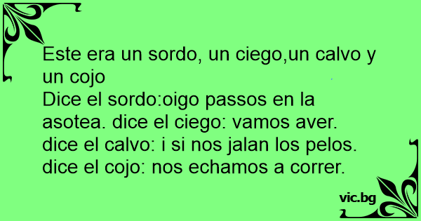 Este era un sordo, un ciego,un calvo y un cojo Dice el sordo:oigo passos en la asotea. dice el ciego: vamos aver. dice el calvo: i si nos jalan los pelos. dice el cojo: nos echamos a correr.
