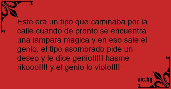 Este era un tipo que caminaba por la calle cuando de pronto se encuentra una lampara magica y en eso sale el genio, el tipo asombrado pide un deseo y le dice genio!!!!! hasme rikooo!!!! y el genio lo violo!!!!