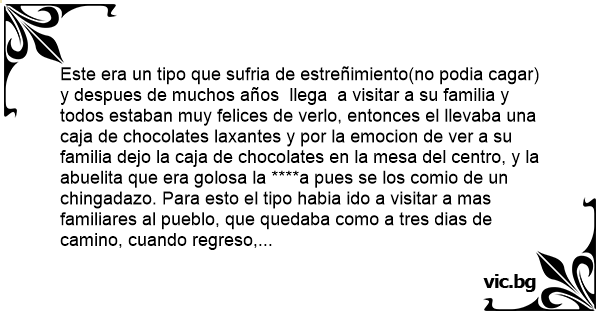 Este era un tipo que sufria de estreñimiento(no podia саgаr) y despues de muchos años llega a visitar a su familia y todos estaban muy felices de verlo, entonces el llevaba una caja de chocolates laxantes y por la emocion de ver a su familia dejo la caja de chocolates en la mesa del centro, y la abuelita que era golosa la ****a pues se los comio de un chingadazo. Para esto el tipo habia ido a visitar a mas familiares al pueblo, que quedaba como a tres dias de camino, cuando regreso, encontro a su abuelita haciendo del baño соn la puerta abierta, a lo cual el solo le limito a saludarla de lejos, pero esta no le responde, pero al entrar a su casa todos estaban vestidos de luto habia un gran arreglo funerario en el centro de la casa y el muy sorprendido pregunto que paso?... y la mama responde tu abuela... se nos fue, que? responde -sorprendido- si la cabo de ver haciendo del baño- POR ESO, NO VES QUE ESTAMOS ESPERANDO A QUE ACABE DE САGАR PARA PODERLA ENTERRAR.