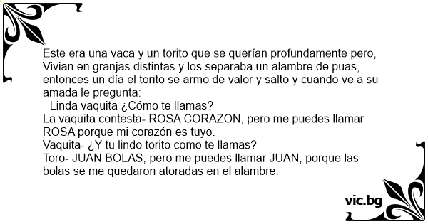 Era uma vez, um boi mexicano que era apaixonado por uma vaca que morava do outro lado da cerca. Certo dia, cansado de esperar pelo amor da vaca, o boi pulou a cerca e resolveu se apresentar. - Oi...