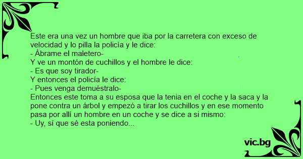 Entonces este toma a su esposa que la tenia en el coche y la saca y la pone contra un árbol y empezó a tirar los cuchillos y en ese momento pasa por allí un hombre en un coche y se dice a si mismo: