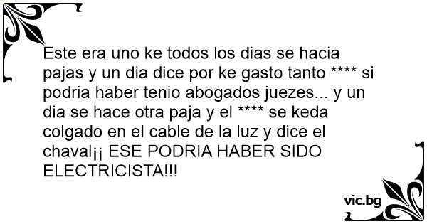 Este era uno ke todos los dias se hacia pajas y un dia dice por ke gasto tanto **** si podria haber tenio abogados juezes... y un dia se hace otra paja y el **** se keda colgado en el cable de la luz y dice el chaval¡¡ ESE PODRIA HABER SIDO ELECTRICISTA!!!