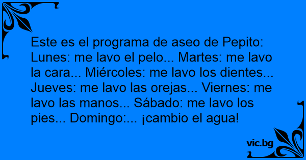 Este es el programa de aseo de Pepito: Lunes: me lavo el pelo... Martes: me lavo la cara... Miércoles: me lavo los dientes... Jueves: me lavo las orejas... Viernes: me lavo las manos... Sábado: me lavo los pies... Domingo:... ¡cambio el agua!