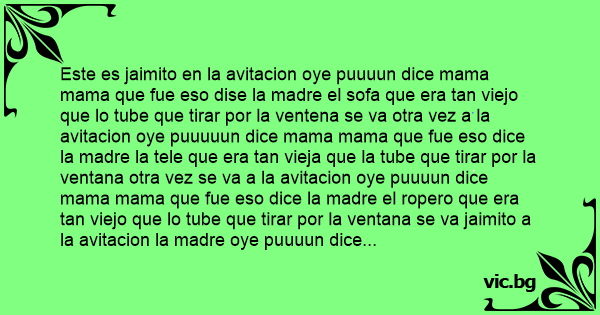 Este es jaimito en la avitacion oye puuuun dice mama mama que fue eso dise la madre el sofa que era tan viejo que lo tube que tirar por la ventena se va otra vez a la avitacion oye puuuuun dice mama mama que fue eso dice la madre la tele que era tan vieja que la tube que tirar por la ventana otra vez se va a la avitacion oye puuuun dice mama mama que fue eso dice la madre el ropero que era tan viejo que lo tube que tirar por la ventana se va jaimito a la avitacion la madre oye puuuun dice jaimito jaimito que fue eso deice jaimito la abuela que era tan vieja que la tube que tirar por la ventana