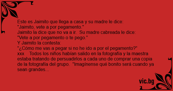 Este es Jaimito que llega a casa y su madre le dice: "Jaimito, vete a por pegamento." Jaimito la dice que no va a ir. Su madre cabreada le dice: "Vete a por pegamento o te pego." Y Jaimito la contesta: "¿Cómo me vas a pegar si no he ido a por el pegamento?" xxx Todos los niños habían salido en la fotografía y la maestra estaba tratando de persuadirlos a cada uno de comprar una copia de la fotografía del grupo. "Imagínense qué bonito será cuando ya sean grandes todos y digan 'Allí está Catalina, es abogada,' o también 'Ese es Miguel. Ahora es doctor." Sonó una vocecita desde atrás del salón: "Y allí está la maestra. Ya se murió.