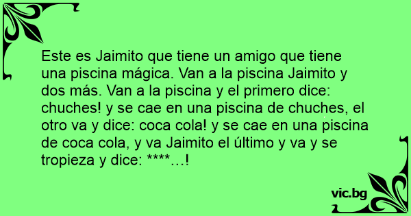 Este es Jaimito que tiene un amigo que tiene una piscina mágica. Van a la piscina Jaimito y dos más. Van a la piscina y el primero dice: chuches! y se cae en una piscina de chuches, el otro va y dice: coca cola! y se cae en una piscina de coca cola, y va Jaimito el último y va y se tropieza y dice: ****…!