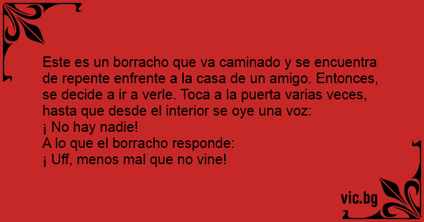 Este es un borracho que va caminado y se encuentra de repente enfrente a la casa de un amigo. Entonces, se decide a ir a verle. Toca a la puerta varias veces, hasta que desde el interior se oye una voz: