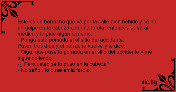 Este es un borracho que va por la calle bien bebido y se da un golpe en la cabeza соn una farola, entonces se va al médico y le pide algún remedio.
