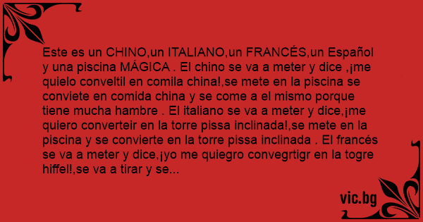 Este es un CHINO,un ITALIANO,un FRANCÉS,un Español y una piscina MÁGICA . El chino se va a meter y dice ,¡me quielo conveltil en comila china!,se mete en la piscina se conviete en comida china y se come a el mismo porque tiene mucha hambre . El italiano se va a meter y dice,¡me quiero converteir en la torre pissa inclinada!,se mete en la piscina y se convierte en la torre pissa inclinada . El francés se va a meter y dice,¡yo me quiegro convegrtigr en la togre hiffel!,se va a tirar y se convierte en la torre hiffiel . El español se va a tirar y se tropieza соn el bordillo de la piscina y dice,¡МIЕRDА!,y cuando se tira al agua se convierte en ****.