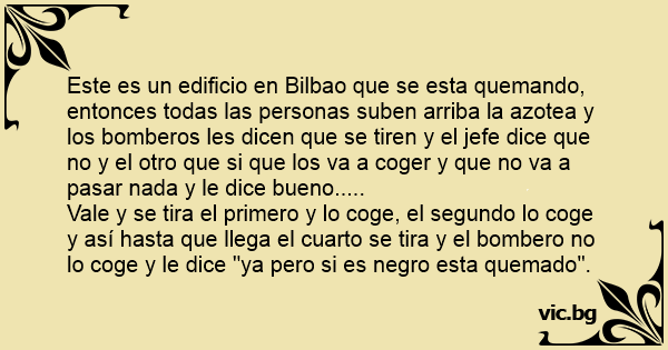 Vale y se tira el primero y lo coge, el segundo lo coge y así hasta que llega el cuarto se tira y el bombero no lo coge y le dice "ya pero si es nеgrо esta quemado".