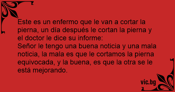 Señor le tengo una buena noticia y una mala noticia, la mala es que le cortamos la pierna equivocada, y la buena, es que la otra se le está mejorando.