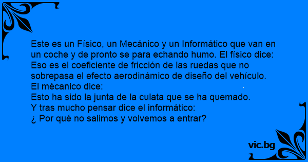 Програмист, електроинженер и механик пътуват с кола. Колата се поврежда. Механика казва: - Сигурно е ремъка. Ей сега ще погледна. Никаква полза. Електроинженера се намесва: - Чакай да видя...