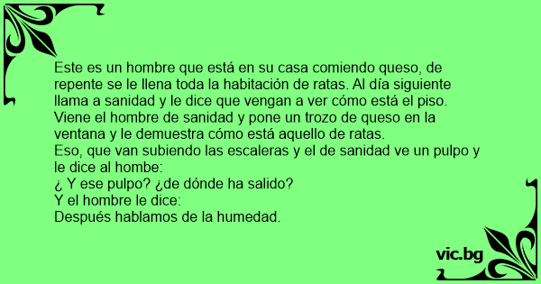 Este es un hombre que está en su casa comiendo queso, de repente se le llena toda la habitación de ratas. Al día siguiente llama a sanidad y le dice que vengan a ver cómo está el piso.