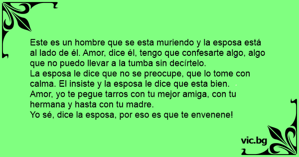 La amante y la esposa изневерявала съм ти няколко пъти reines Gewissen Εξομολογήσεις Δηλητηριαση Jakob liegt im Sterben. Seine Frau sitzt auf der Bettkante. Er schaut hoch und sagt ganz schwach: Marco sta morendo e sua moglie gli siede accanto. La guarda e le dice con una debolissima voce: Luigi sta morendo e sua moglie gli siede accanto. Lui non smette di guardarla e con una voce debolissima le dice: My wife was dying. I was by her bedside. Lucrezia Borgia satt vid sin man dödsbädd och höll honom i handen medan tårarna strömmade nerför hennes kinder. Plötsligt särade hennes man på de bleka läpparna och viskade: - älskling, jag måste... O marido estava em seu leito de morte e chamou a esposa. Com voz rouca e já bem fraca, diz à mulher: — Meu bem, chegue mais perto. Eu quero lhe fazer uma confissão! — Não, não — respondeu a mulher.... Mąż na łożu śmierci wyznaje żonie swój życiowy sekret: - Przez 20 lat Cię zdradzałem... Żona: - A Ty myślisz, że ja bym Cię tak bez powodu otruła?! Am Sterbebett. Mann: „Schatz, ich muss dir was beichten. Ich habe mit deiner Mutter, Schwester und besten Freundin geschlafen.“ Sie: „Weiß ich doch. Und jetzt bleib liegen, dass das Gift schön... O femeie pe patul de moarte. Soţul, lîngă ea cu lacrimi în ochi o mîngîie. - Dragă, zice soţia, trebuie să îţi spun ceva. - Nu, dragă, stai liniştită, nu vorbi. - Ba da, trebuie să-ţi spun că te-am... Sotia era pe patul de moarte: - Dragul meu, vreau sa iti zic ceva.. - Lasa, draga mea, nu te obosi.. - Ba da, te rog.. - Bine, zii. - Vreau sa iti marturisesc ca te-am inselat cu toti prietenii... Sul letto di morte, all’ospedale. Lui le tiene la fragile e fredda mano, pregando, con le lacrime agli occhi. Lei muove appena le sue pallide labbra, mentre le parole paiono un lungo sospiro:... Facet na łożu śmierci zwierza się swojej żonie: - Nie mogę umrzeć bez wyznania ci prawdy. Przez całe nasze małżeństwo cię zdradzałem. Te wszystkie wieczory, w które niby pracowałem, spędzałem z... Vīrs guļ uz nāves gultas,mirstot saka sievai: - Gribu tev pirms nāves pateikt visu patiesību. Es pārgulēju ar tavu māsu un māti. - Zinu,dārgais,tāpēc jau es tevi noindēju. A férj halálos ágyán: - Drágám be kell valljak valami! - Mit drágám? - Sajnos megcsaltalak. - Tudom drágám, ezért mérgeztelek meg. "Bak karıcığım, ben ölmek üzereyim. Ölmeden önce sana bir itirafta bulunacağım. Seni aldattım, hem de bu evde senin yatağında." der... "Biliyorum" der kadın da, "Yoksa seni niye zehirlerdim ki?" Un homme est au chevet de sa femme qui va bientôt mourir... - Chéri, dit la dame dans un souffle. - Chut ne parle pas , lui dit son mari Mais la femme insiste : - Chéri  je doit avouer quelque... C'est une femme qui est à l'article de la mort. Son mari lui tient la main, près du lit. Le mari a des larmes qui coulent doucement le long de ses joues. Bref, c'est triste. La femme essaie de... Deitada no seu leito de morte, a mulher segura a mão do marido e chora: — Querido, deixe-me falar. Tenho que te confessar algo... por dois anos eu te traí com Daniel, teu melhor amigo... - Tudo... Temel ölüm döşeğindedir. Karısını yanına çağırır: - "Bak Fadime, artık ölmek üzereyim sana söylemek istediğim birkaç şey var." - "Dinliyorum." - "Ben seni birçok kere aldattım." - "Biliyorum." -... Soţul pe patul de moarte: - Iubito, trebuie să ştii ceva. - Ce, dragă? - Te-am înşelat cu fata de la magazinul de bijuterii. - Ştiu, iubitule, de-aia te-am otrăvit. Je ženská na smrtelný posteli a vedle ní stojí její manžel. manželka říká: miláčku něco důležitého ti musím říct. nenamáhej se a nic mi neříkej. ne já musím nemůžu umřít aniž bych ti to neřekla:...
