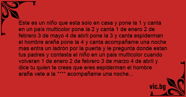 Este es un niño que esta solo en casa y pone la 1 y canta en un país multicolor pone la 2 y canta 1 de enero 2 de febrero 3 de mayo 4 de abril pone la 3 y canta espiderman el hombre araña pone la 4 y canta acompañame una noche mas entra un ladrón por la puerta y le pregunta donde estan tus padres y contesta el niño en un pais multicolor cuando volveran 1 de enero 2 de febrero 3 de marzo 4 de abril y dice tu quien te crees que eres espiderman el hombre araña vete a la **** acompañame una noche mas.