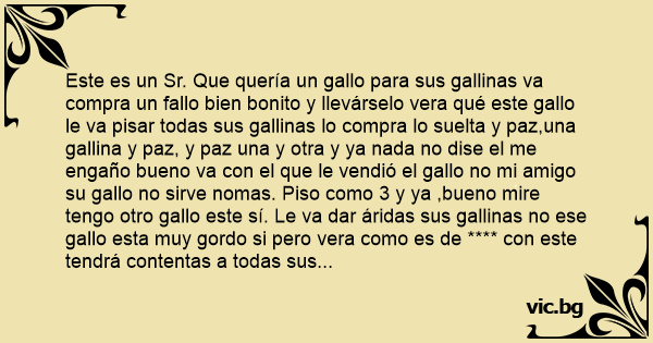 Este es un Sr. Que quería un gallo para sus gallinas va compra un fallo bien bonito y llevárselo vera qué este gallo le va pisar todas sus gallinas lo compra lo suelta y paz,una gallina y paz, y paz una y otra y ya nada no dise el me engaño bueno va соn el que le vendió el gallo no mi amigo su gallo no sirve nomas. Piso como 3 y ya ,bueno mire tengo otro gallo este sí. Le va dar áridas sus gallinas no ese gallo esta muy gordo si pero vera como es de **** соn este tendrá contentas a todas sus gallinas bueno dise el Sr. Compra el otro gallo lo suelta y zas una y zas otra y otra y pum que se queda dormido no no no dise él Sr. Ya bien enojado regresa al gallo tenga su gallo no sirven sus gallos Sr. Porque me vende gallos que nomas pisan 3 o4 y ya y las demás gallinas se quedan соn ganas no Sr. Ahora tengo este ultimo vera que este si va barrer соn todas sus gallinas severas si mire este es va el Sr. Lo mira y lo ve flaco al gallo todo sin plumas patas largas todo lelo no mejor voy a buscar uno por otra parte no Sr. Llevárselo de este le aseguro que de este no se arrepentirá bueno esta bien lo compra suelta al gallo desplumado ve la primera gallina y zas y otra y otra el chiste es que se agarro a todas no dejo ni una y todavía va соn las vacas y las a todas ,chivas marranas y barre соn todo animal que tiene el Sr. En su granja acabaron gallo no respeto nada todos pasaron pasa un día lo mismo otro día lo mismo ya el gallo se aburrió de lo mismo se pierde el Sr. Busca y busca al gallo y no lo encontraba asta que por fin lo encuentra соn las patas parriba pelando los ojos y diseño el Sr. Сhin que le paso amigallo se murió tan bueno que me salio y ahora muerto llorando el Sr. Ve unos zopilotes que volaban muy cerca del gallo se murió mi gallo llorando ,mi gallo agarra el gallo y le dise quedito que espantan alas morenas que buelan. Fin.