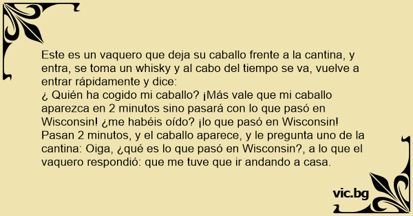 Pasan 2 minutos, y el caballo aparece, y le pregunta uno de la cantina: Oiga, ¿qué es lo que pasó en Wisconsin?, a lo que el vaquero respondió: que me tuve que ir andando a casa.