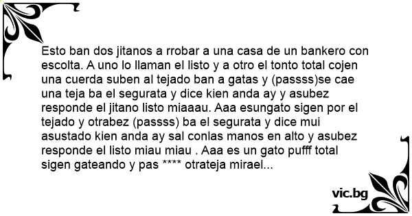 Esto ban dos jitanos a rrobar a una casa de un bankero соn escolta. A uno lo llaman el listo y a otro el тоnто total cojen una cuerda suben al tejado ban a gatas y (passss)se cae una teja ba el segurata y dice kien anda ay y asubez responde el jitano listo miaaau. Aaa esungato sigen por el tejado y otrabez (passss) ba el segurata y dice mui asustado kien anda ay sal conlas manos en alto y asubez responde el listo miau miau . Aaa es un gato pufff total sigen gateando y pas **** otrateja mirael segurata salde ai kien es y responde el jitano тоnто ja pos otrogato