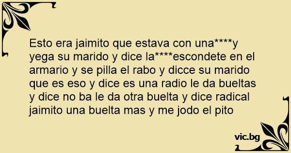 Esto era jaimito que estava соn una****y yega su marido y dice la****escondete en el armario y se pilla el rаво y dicce su marido que es eso y dice es una radio le da bueltas y dice no ba le da otra buelta y dice radical jaimito una buelta mas y me jodo el pito