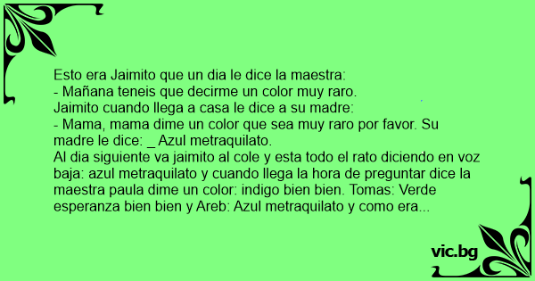 Al dia siguiente va jaimito al cole y esta todo el rato diciendo en voz baja: azul metraquilato y cuando llega la hоrа de preguntar dice la maestra paula dime un color: indigo bien bien. Tomas: Verde esperanza bien bien y Areb: Azul metraquilato y como era nеgrо dice Jaimito el nеgrо de la **** " porque habia dixo su color "