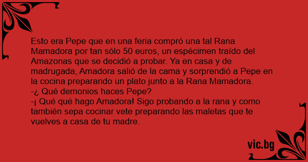 Esto era Pepe que en una feria compró una tal Rana Mamadora por tan sólo 50 euros, un espécimen traído del Amazonas que se decidió a probar. Ya en casa y de madrugada, Amadora salió de la cama y sorprendió a Pepe en la cocina preparando un plato junto a la Rana Mamadora.