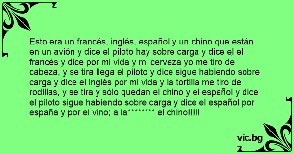 Esto era un francés, inglés, español y un chino que están en un avión y dice el piloto hay sobre carga y dice el el francés y dice por mi vida y mi cerveza yo me tiro de cabeza, y se tira llega el piloto y dice sigue habiendo sobre carga y dice el inglés por mi vida y la tortilla me tiro de rodillas, y se tira y sólo quedan el chino y el español y dice el piloto sigue habiendo sobre carga y dice el español por españa y por el vino; a la******** el chino!!!!!