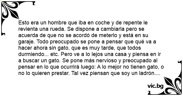 Esto era un hombre que iba en coche y de repente le revienta una rueda. Se dispone a cambiarla pero se acuerda de que no se acordó de meterlo y está en su garaje. Todo preocupado se pone a pensar que qué va a hacer ahora sin gato, que es muy tarde, que todos durmiendo... etc. Pero ve a lo lejos una casa y piensa en ir a buscar un gato. Se pone más nervioso y preocupado al pensar en lo que ocurrirá luego: A lo mejor no tienen gato, o no lo quieren prestar. Tal vez piensan que soy un ladrón. Finalmente se decide y cuando va de camino se para un coche. No sabe si acercarse a pedirle el gato. A saber quién es y por qué se paró. Se pone más nervioso y se va para la casa. Allí nuevamente se vuelve a preocupar si llamar o no cuando de repente se abre la puerta y una señora dice: