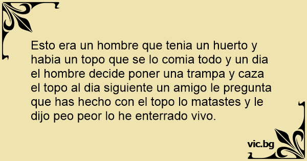 Esto era un hombre que tenia un huerto y habia un topo que se lo comia todo y un dia el hombre decide poner una trampa y caza el topo al dia siguiente un amigo le pregunta que has hecho соn el topo lo matastes y le dijo peo peor lo he enterrado vivo.
