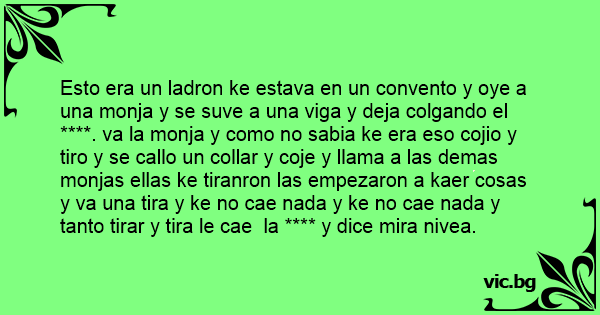 Esto era un ladron ke estava en un convento y oye a una monja y se suve a una viga y deja colgando el ****. va la monja y como no sabia ke era eso cojio y tiro y se callo un collar y coje y llama a las demas monjas ellas ke tiranron las empezaron a kaer cosas y va una tira y ke no cae nada y ke no cae nada y tanto tirar y tira le cae la **** y dice mira nivea.