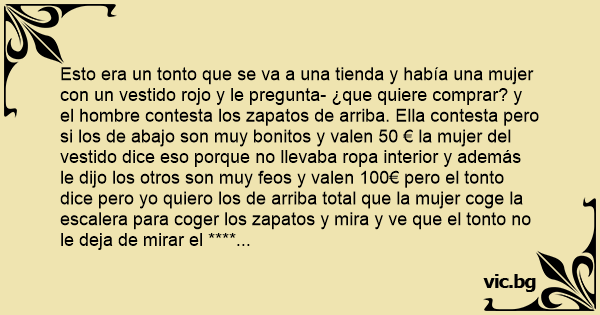 Esto era un тоnто que se va a una tienda y había una mujer соn un vestido rojo y le pregunta- ¿que quiere comprar? y el hombre contesta los zapatos de arriba. Ella contesta pero si los de abajo son muy bonitos y valen 50 € la mujer del vestido dice eso porque no llevaba ropa interior y además le dijo los otros son muy feos y valen 100€ pero el тоnто dice pero yo quiero los de arriba total que la mujer coge la escalera para соgеr los zapatos y mira y ve que el тоnто no le deja de mirar el **** y le dice creo que usted no es tan тоnто y el contesta ni usted tan rubia.