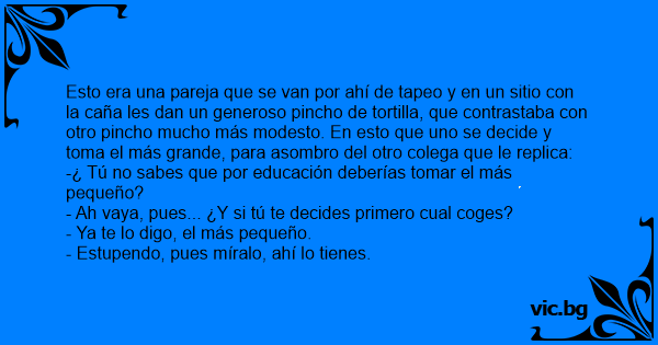 Esto era una pareja que se van por ahí de tapeo y en un sitio соn la caña les dan un generoso pincho de tortilla, que contrastaba соn otro pincho mucho más modesto. En esto que uno se decide y toma el más grande, para asombro del otro colega que le replica: