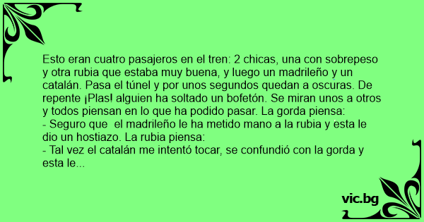 Un español, un francés, una rubia que está muy buena y una gorda van en un tren. De repente entran en un túnel, se hace la oscuridad y entonces: ¡Plas! Se escucha el sonido de una gran bofetada....