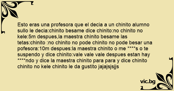 Esto eras una profesora que el decia a un chinito alumno sullo le decia:chinito besame dice chinito:no chinito no kele:5m despues,la maestra chinito besame las tetas:chinito :no chinito no pode chinito no pode besar una pofesora:10m despues:la maestra chinito o me ****s o te suspendo y dice chinito:vale vale vale despues estan hay ****ndo y dice la maestra chinito para para y dice chinito chinito no kele chinito le da gustito jajajsjsjjs