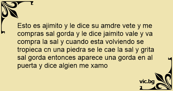 Esto es ajimito y le dice su amdre vete y me compras sal gorda y le dice jaimito vale y va compra la sal y cuando esta volviendo se tropieca cn una piedra se le cae la sal y grita sal gorda entonces aparece una gorda en al puerta y dice algien me xamo