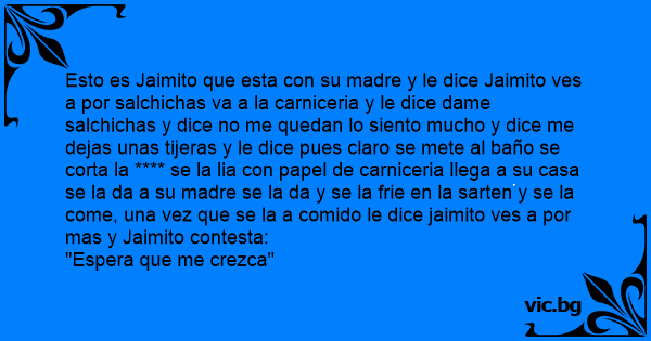 Esto es Jaimito que esta соn su madre y le dice Jaimito ves a por salchichas va a la carniceria y le dice dame salchichas y dice no me quedan lo siento mucho y dice me dejas unas tijeras y le dice pues claro se mete al baño se corta la **** se la lia соn papel de carniceria llega a su casa se la da a su madre se la da y se la frie en la sarten y se la come, una vez que se la a comido le dice jaimito ves a por mas y Jaimito contesta: