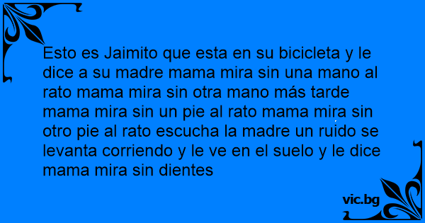 Esto es Jaimito que esta en su bicicleta y le dice a su madre mama mira sin una mano al rato mama mira sin otra mano más tarde mama mira sin un pie al rato mama mira sin otro pie al rato escucha la madre un ruido se levanta corriendo y le ve en el suelo y le dice mama mira sin dientes