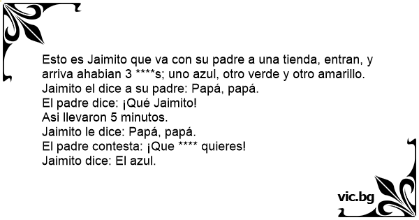 Esto es Jaimito que va соn su padre a una tienda, entran, y arriva ahabian 3 ****s; uno azul, otro verde y otro amarillo.